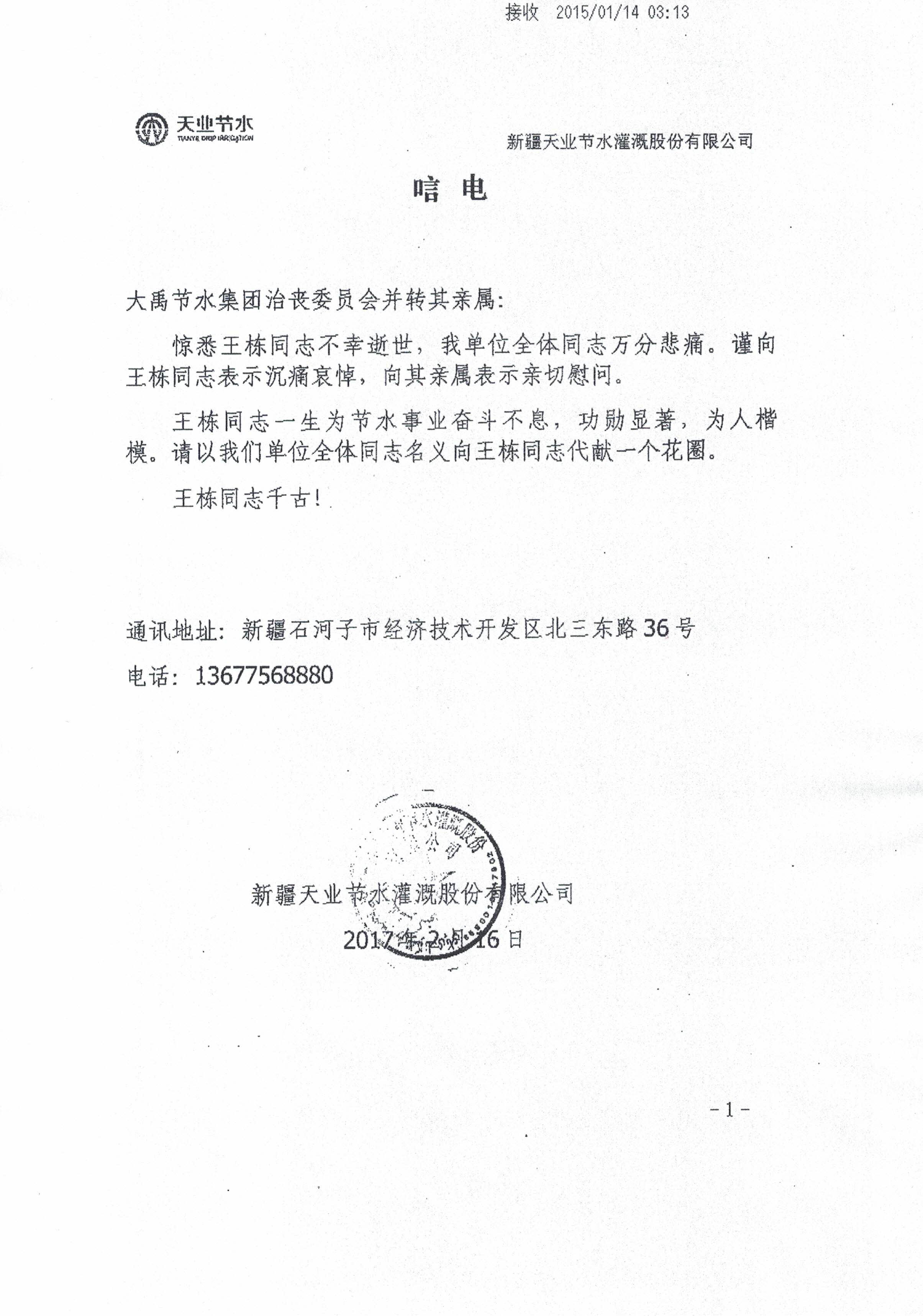 新疆天业节水灌溉股份有限公司唁电