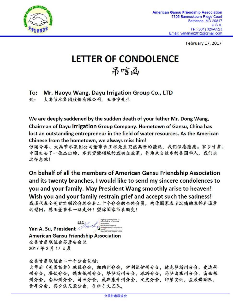 全美甘肃联谊会唁电